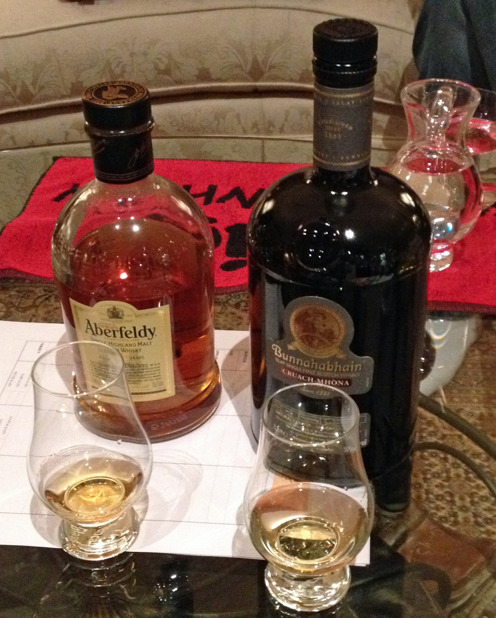 Sharon Seibt hosted the final For Peat’s Sake meeting of 2013 and all agreed that the two whiskies tasted were the best of the year. Information provided by Sharon and her husband, Diet, helped us understand the history of the two whiskies: Aberfeldy 12 and Bunnahabhain – Cruach-MHona.